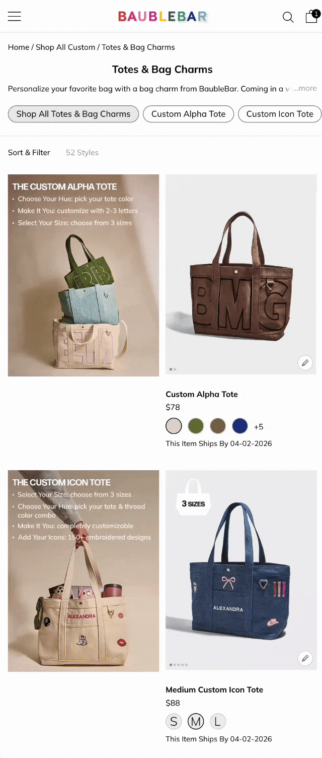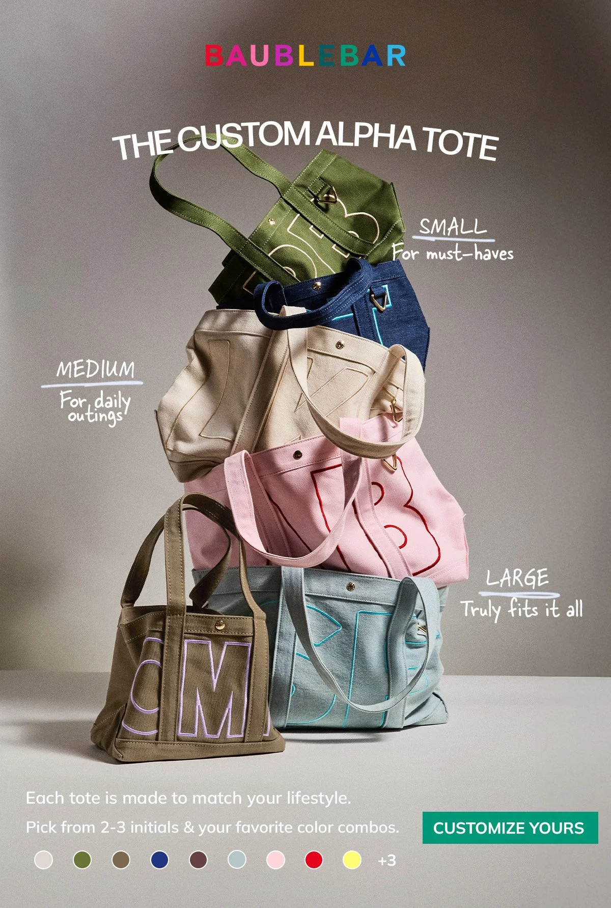 Creative direction for the launch of BaubleBar’s Alpha Tote, a customizable bag designed to highlight the brand’s playful approach to personalization. Led creative across campaign imagery, ecommerce storytelling, and digital marketing assets, supporting the introduction of a new site customizer experience.